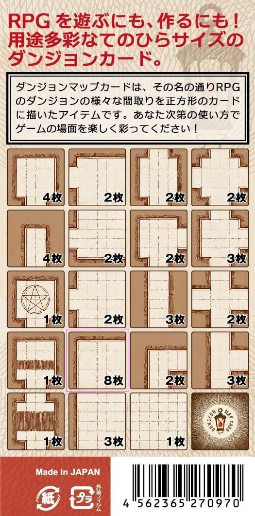 ダンジョンマップカードは、様々な間取りが記載された正方形のカードに描いたアイテムです。その名の通り、RPGのダンジョンをあなた次第の使い方で構築や再現でき、ゲーム場面を演出します!