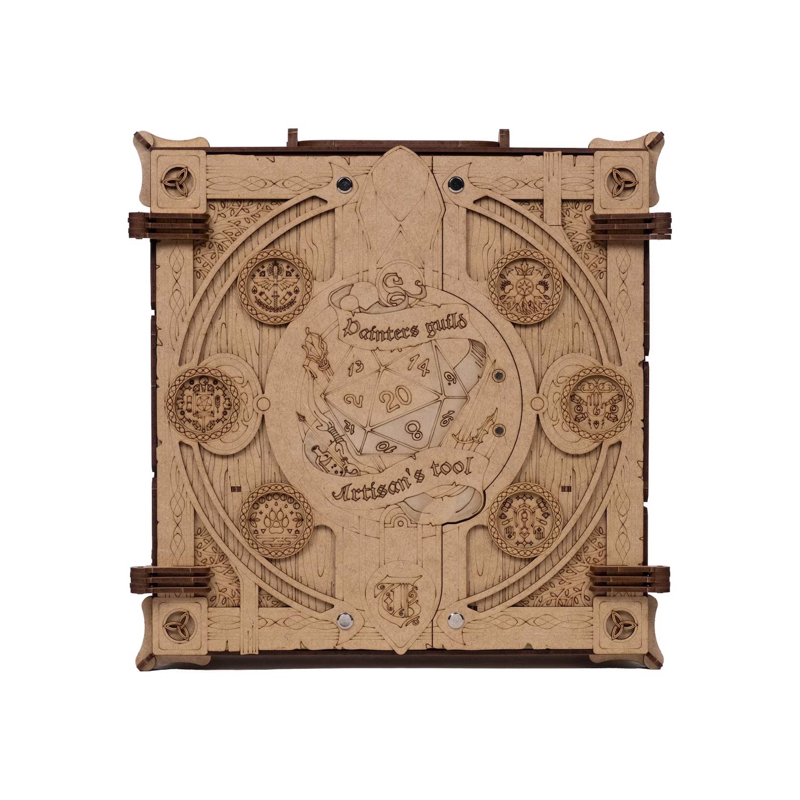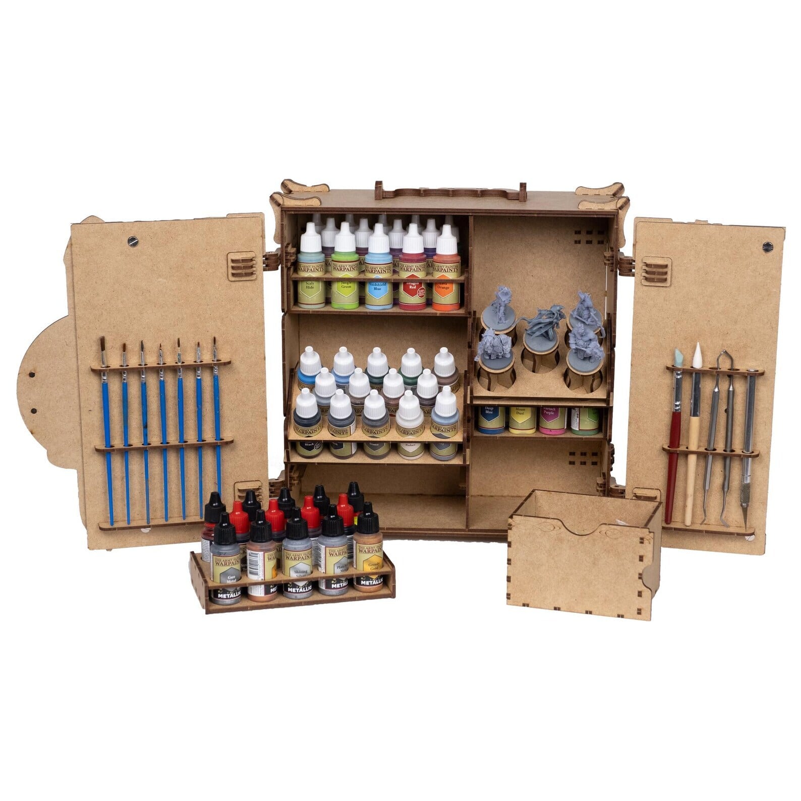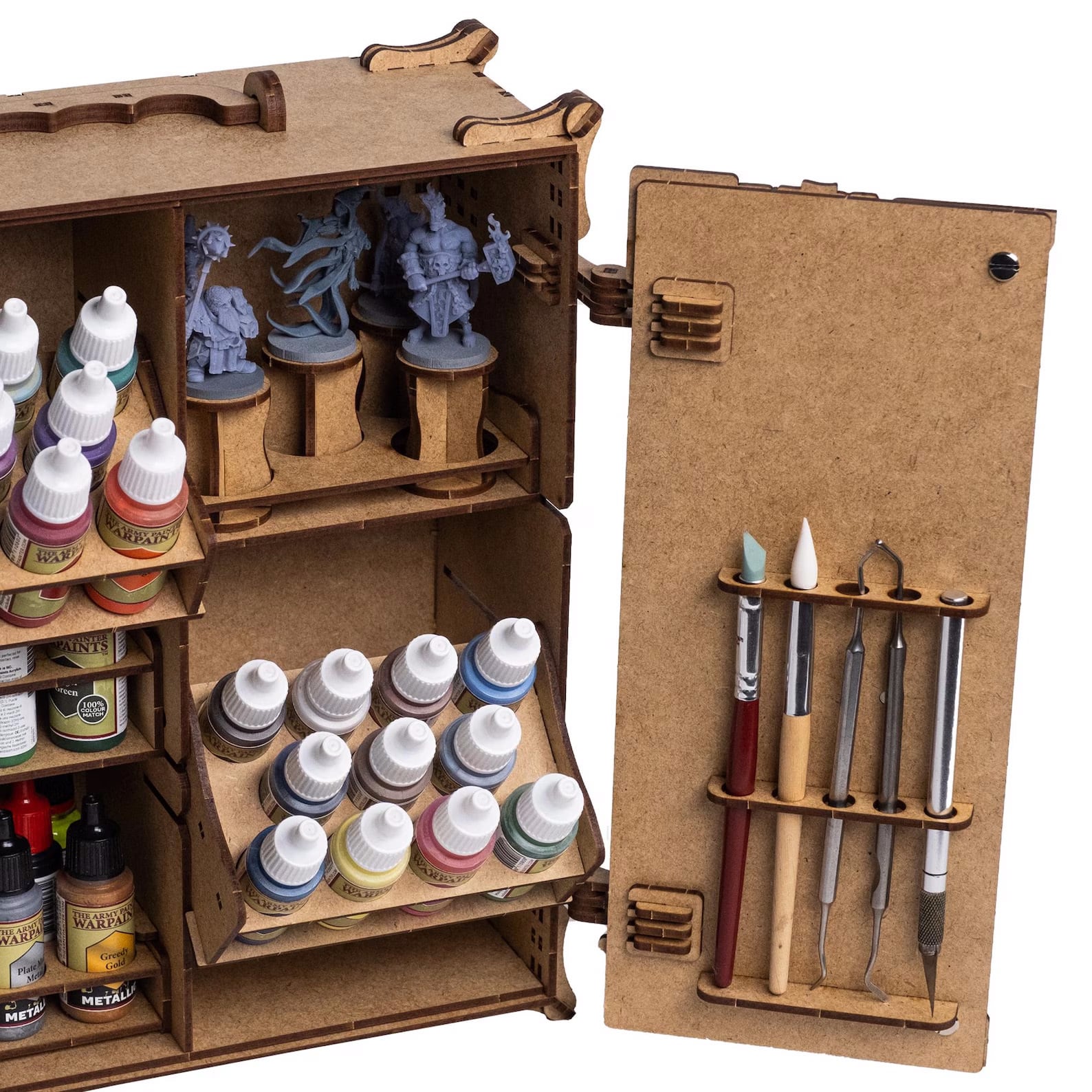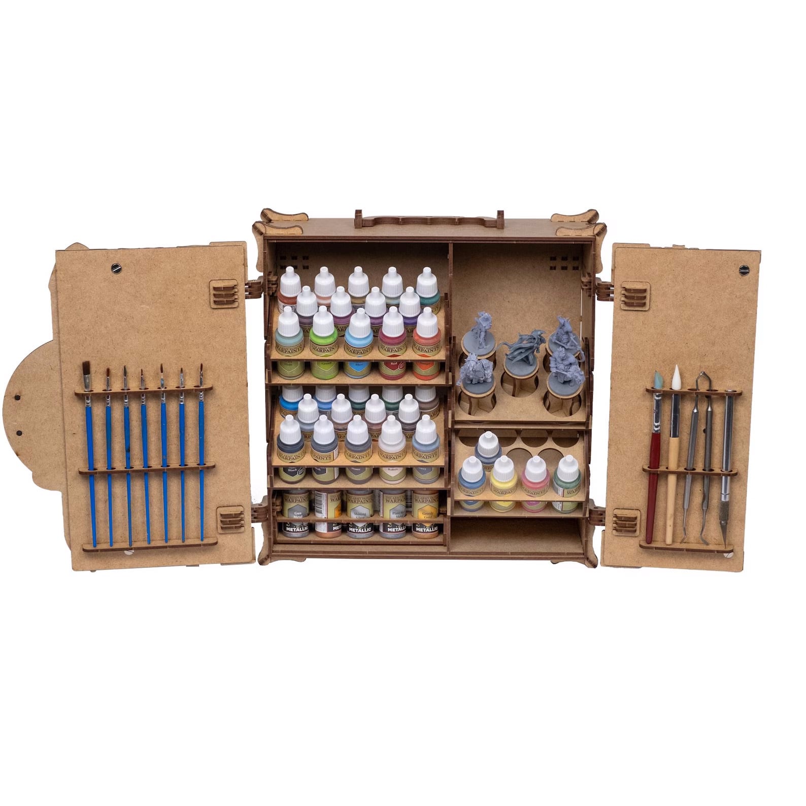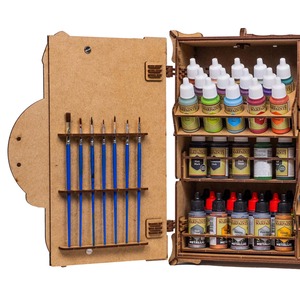 ファレホやアーミーペインターといった25mm経塗料ボトルに加え、筆や工具、ミニチュア塗装ハンドルも含めたオールインワンの持ち運び可能な取っ手付き収納ボックスです。