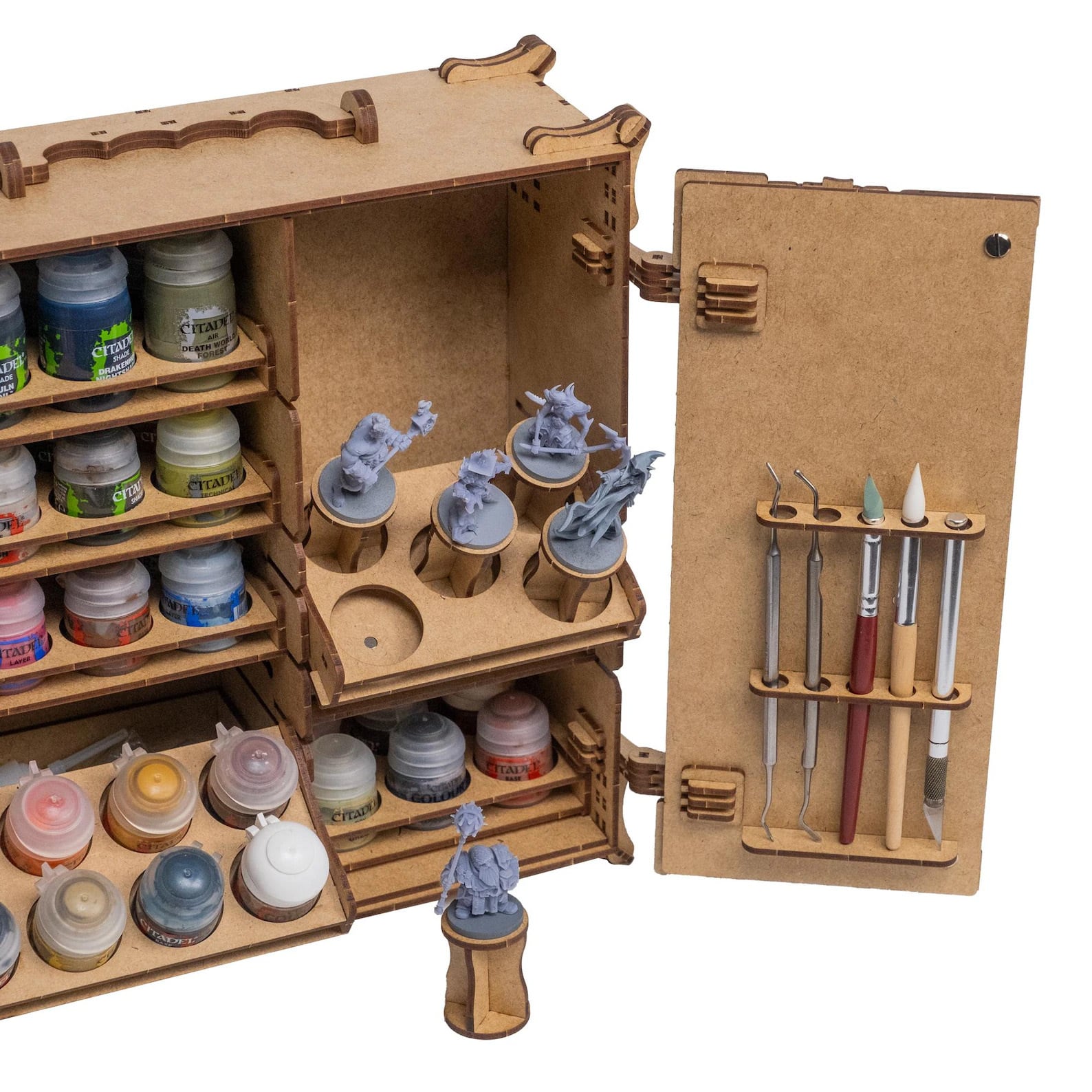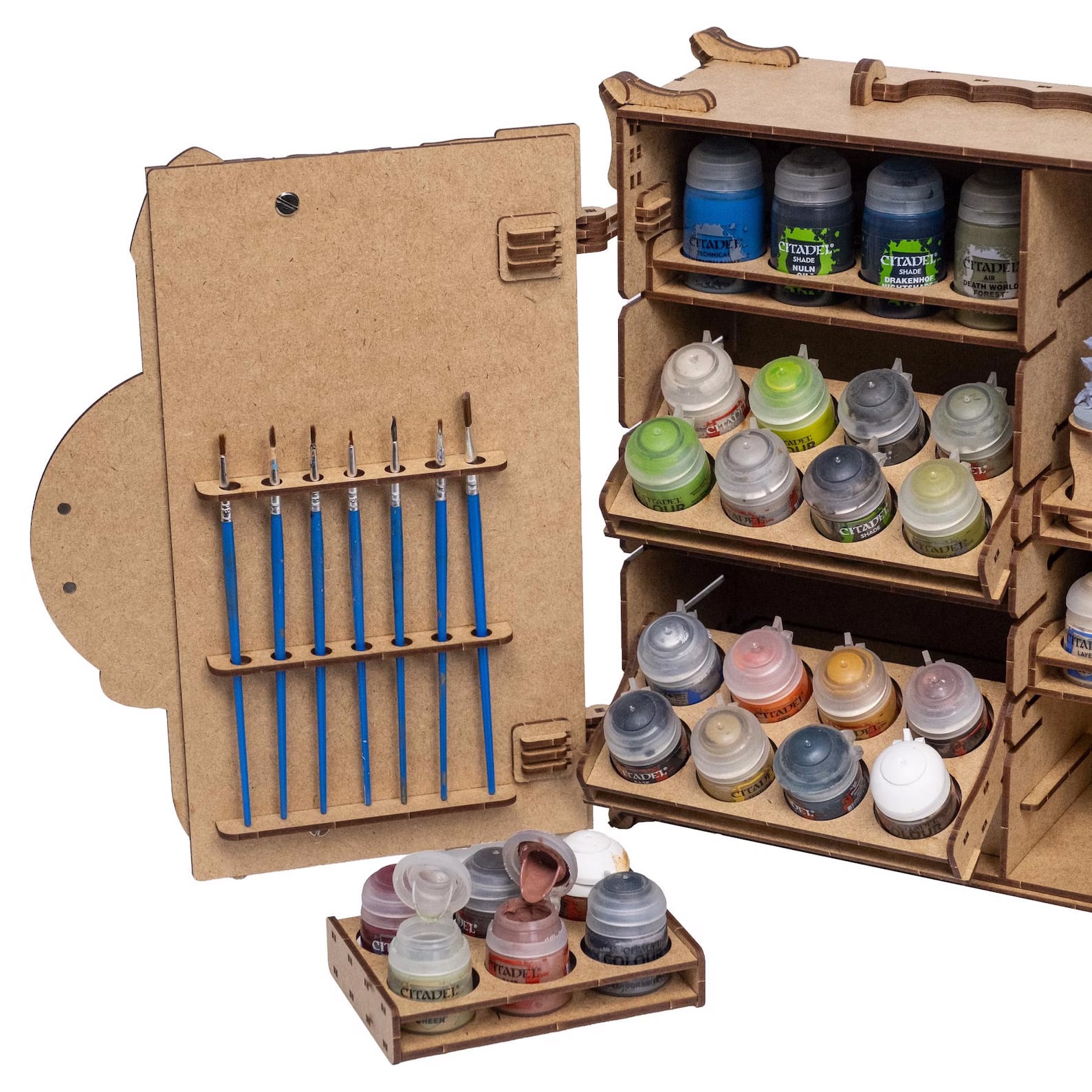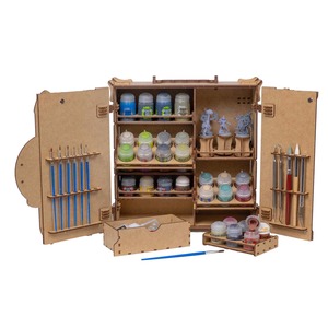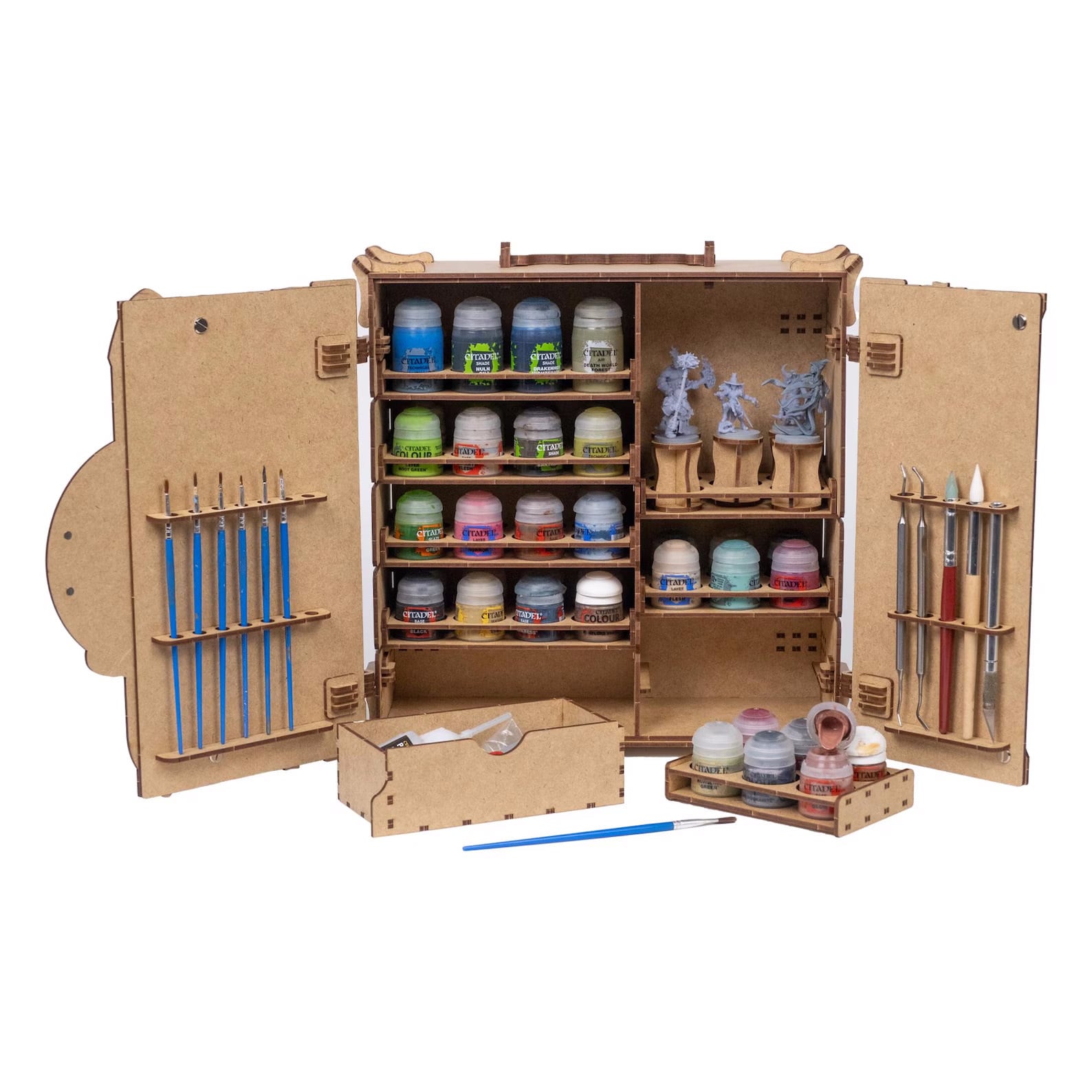 シタデルカラーといった34mm経塗料ボトルに加え、筆や工具、ミニチュア塗装ハンドルも含めたオールインワンの持ち運び可能な取っ手付き収納ボックスです。