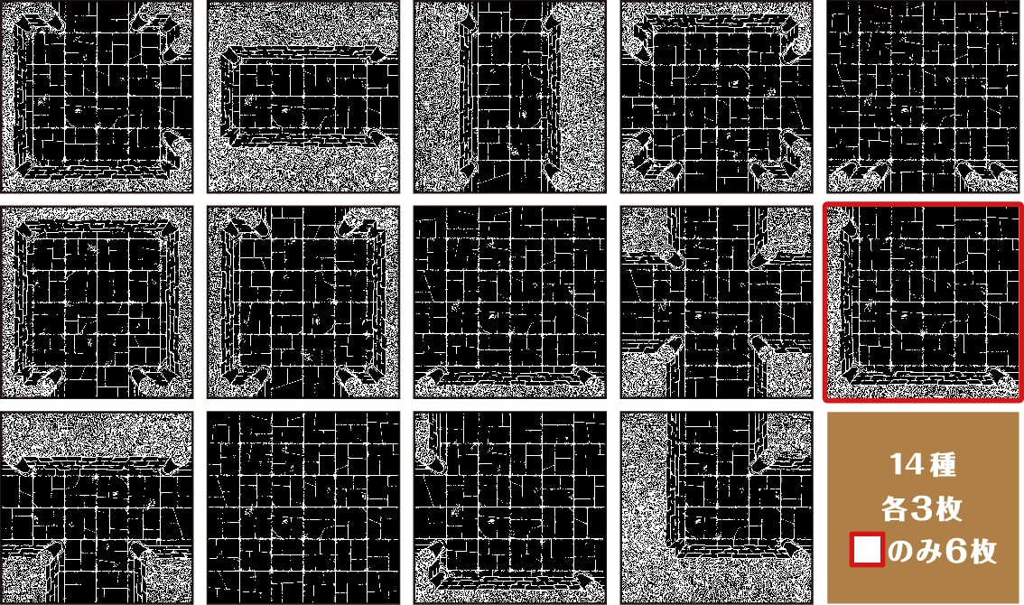 約25mmサイズの6×6マスで区切られた全14種の様々な区画を組み合わせれば、あっという間に冒険の舞台となるダンジョンが出来上がります。