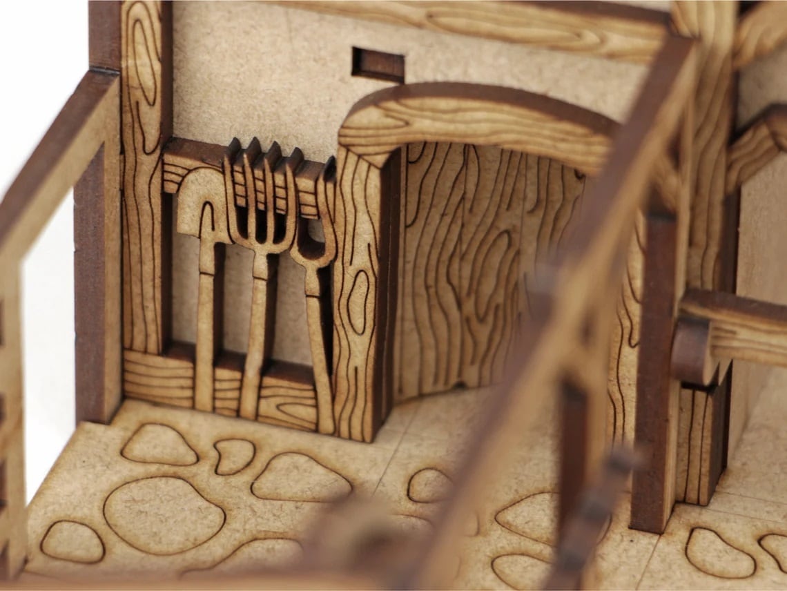 ウクライナダンジョンはMDF製の組み立て式情景モデルです。床面には約1インチの四角マスが彫り込まれ、高さも準じて規格化されているため、ミニチュアゲームのテレインはもとよりTRPGのマップとしても機能致します。それぞれ区分けされ自由に組み換え可能で、オリジナルダンジョン作りだけで1日を消費できます。