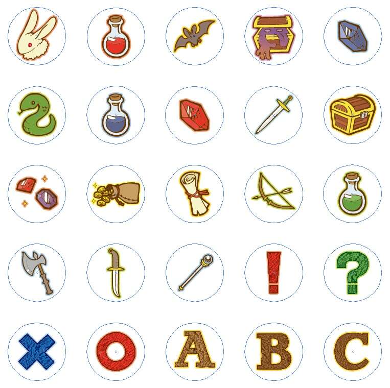 「ダンジョンマーカー」は直径22㎜×8㎜厚の円柱コマ15個(赤青黄の3色、各5個)と、直径20㎜の円形イラストシール50枚をセットにしたものです。